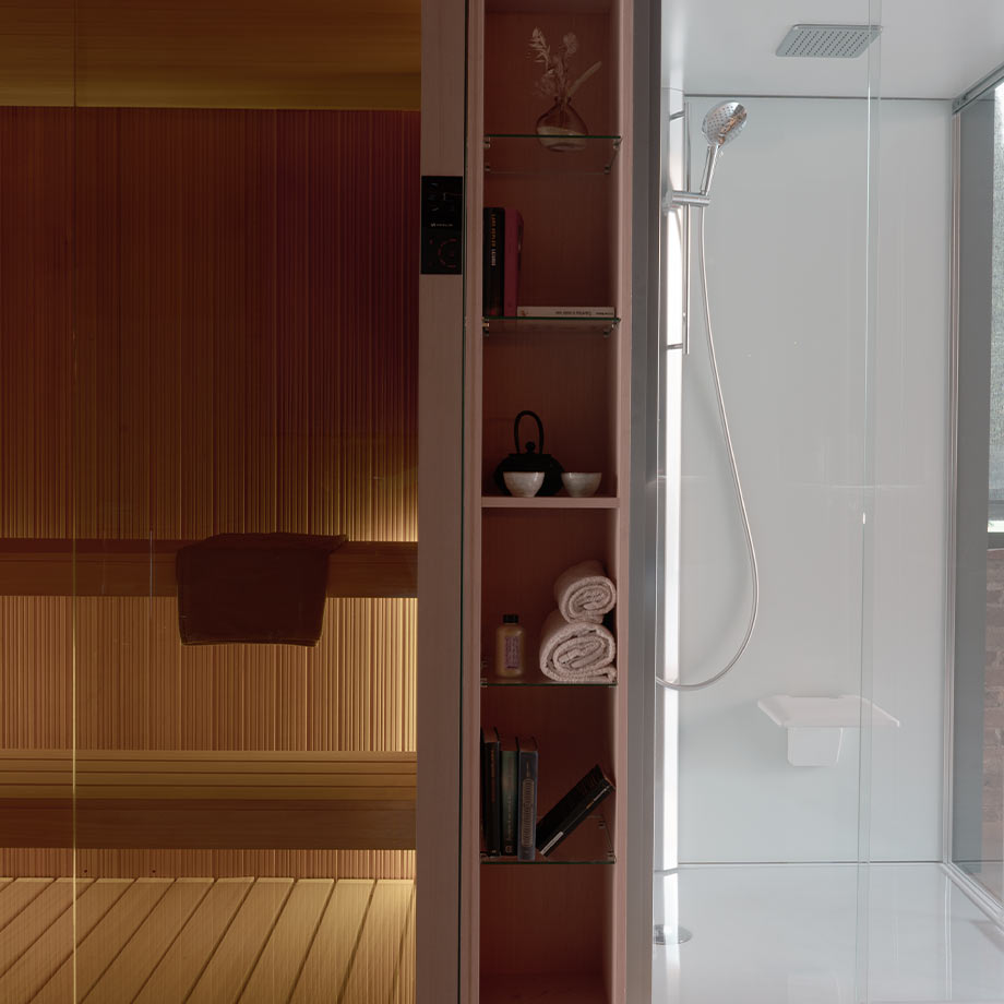 Die Verbindung einer Glax Novellini-Kabine mit der Fun-Sauna wurde im Hinblick auf Praktikabilität und Funktionalität konzipiert. Diese Verbindung optimiert den Raum und macht das Erlebnis noch vollständiger, zugänglicher und vielseitiger, ohne dabei auf Komfort und Qualität zu verzichten.